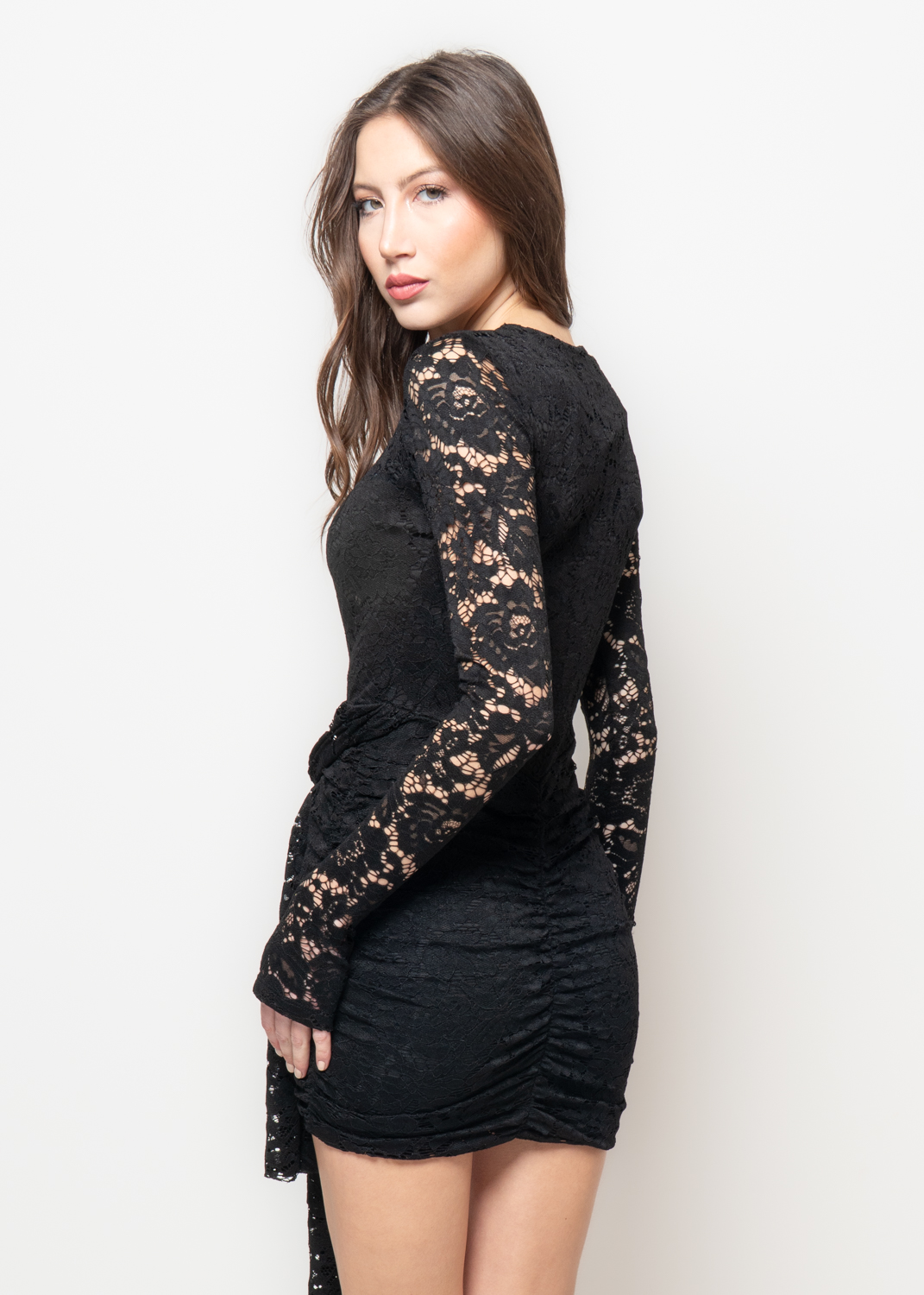 Vestitino nero elegante realizzato in pizzo elasticizzato con maniche lunghe trasparenti e una profonda scollatura frontale a goccia. Il taglio corto aderente esalta la silhouette, mentre il drappeggio laterale scolpisce il punto vita con fascino. Il tessuto sensuale abbraccia il corpo, combinando romanticismo e seduzione in un’estetica decisa e moderna.