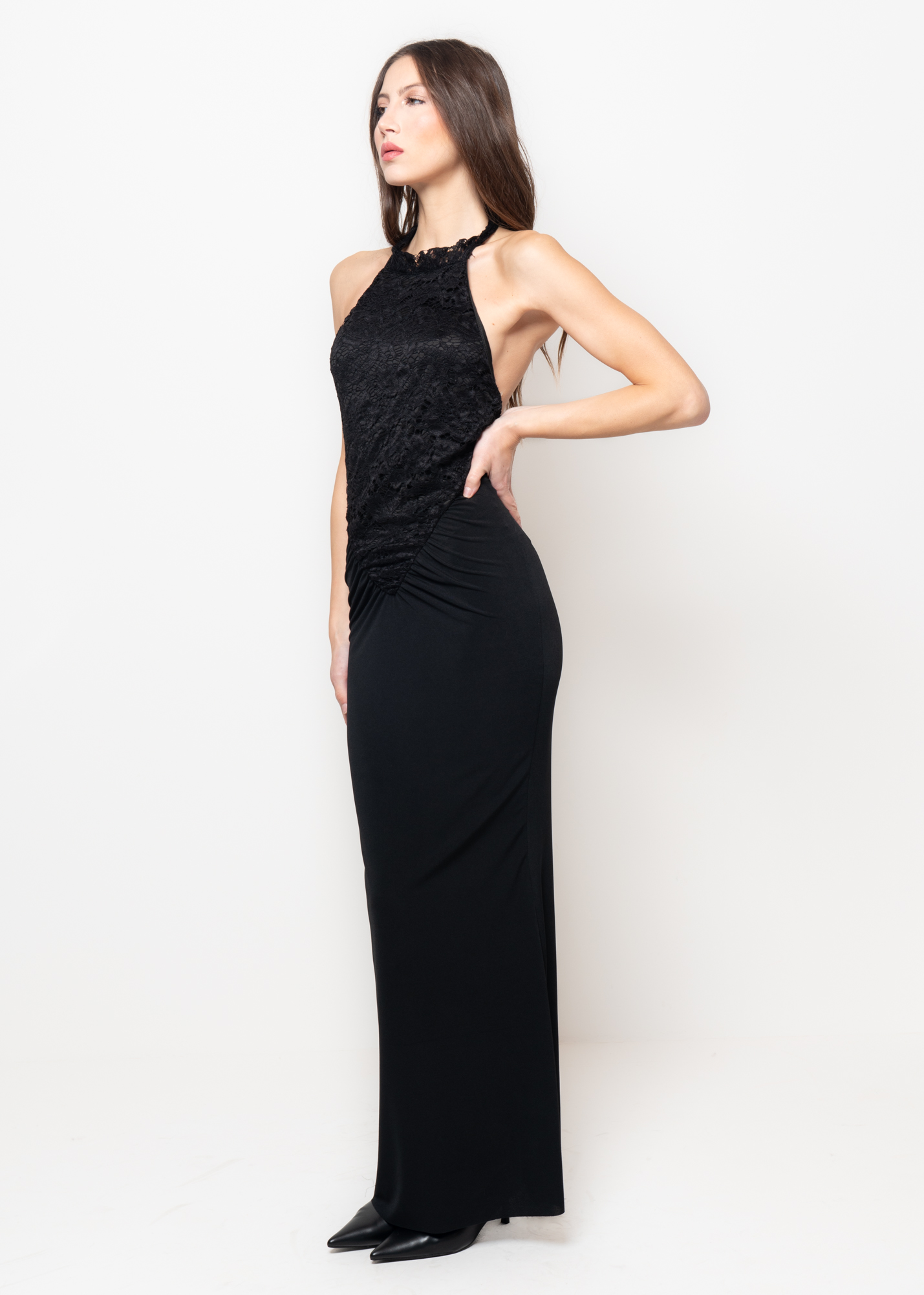 Abito lungo nero in tessuto elasticizzato con corpetto in pizzo a collo alto e chiusura all’americana. La schiena completamente scoperta e la gonna a linea morbida creano un contrasto tra eleganza e sensualità. Il pizzo ricamato valorizza il busto, mentre il drappeggio laterale in vita modella la figura con un effetto raffinato.