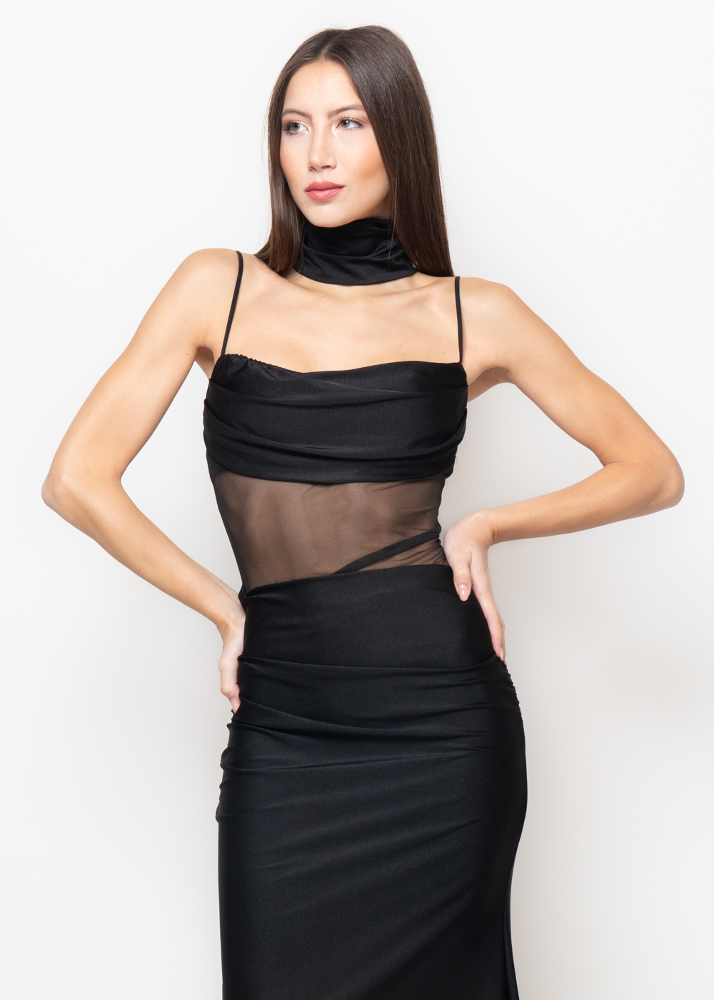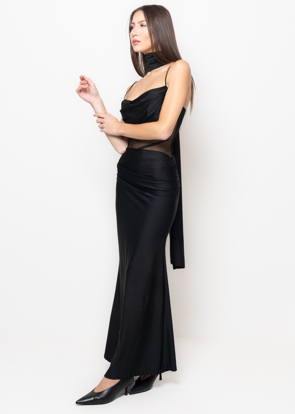 Abito lungo nero in tessuto fluido con pannelli in tulle che creano trasparenze sofisticate e foulard drappeggiato integrato sulle spalle per un effetto esclusivo. Il taglio aderente in vita valorizza la silhouette, mentre la lunghezza totale e lo scollo rotondo donano eleganza. Ideale per occasioni formali dove si vuole un look forte e raffinato.