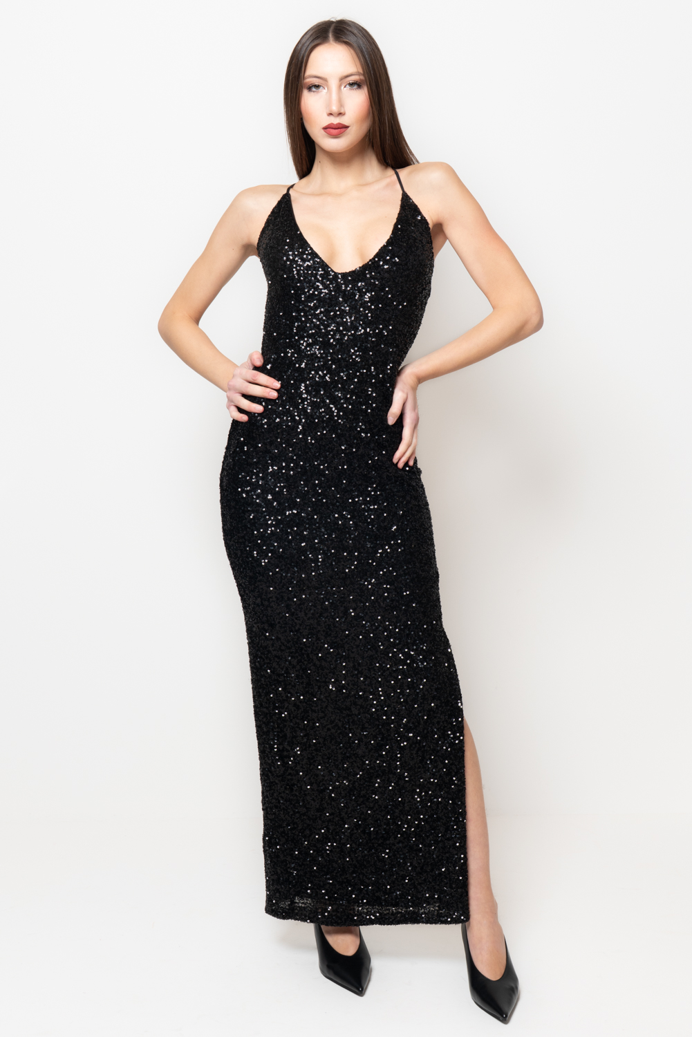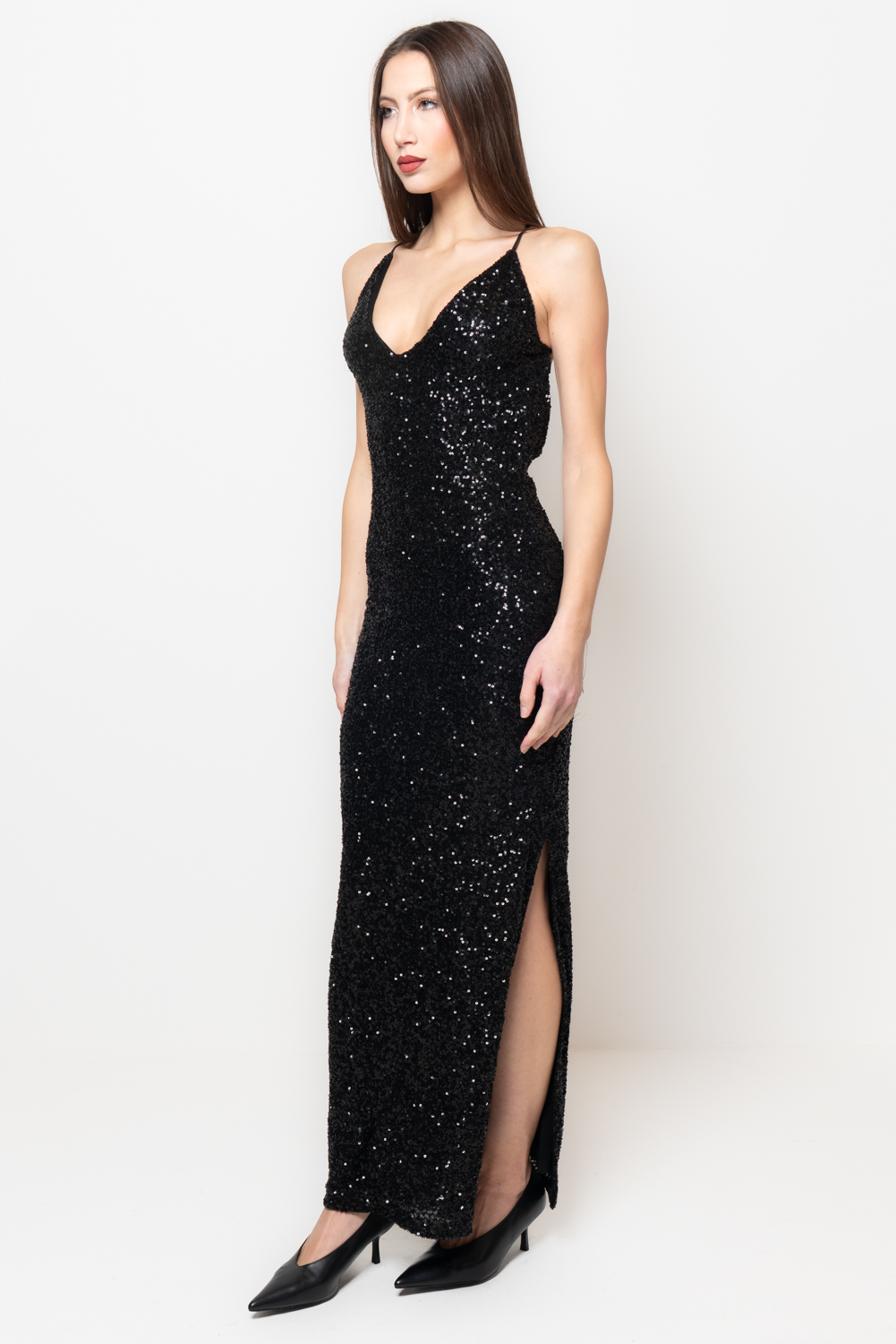 Realizzato in tessuto stretch interamente ricoperto di paillettes nere, questo abito aderente valorizza la silhouette con una linea fasciante. Lo scollo a V profondo e le sottili spalline aggiungono un tocco seducente e moderno. Perfetto come abito nero elegante per serate e occasioni speciali, combina raffinatezza e audacia con un finish brillante.