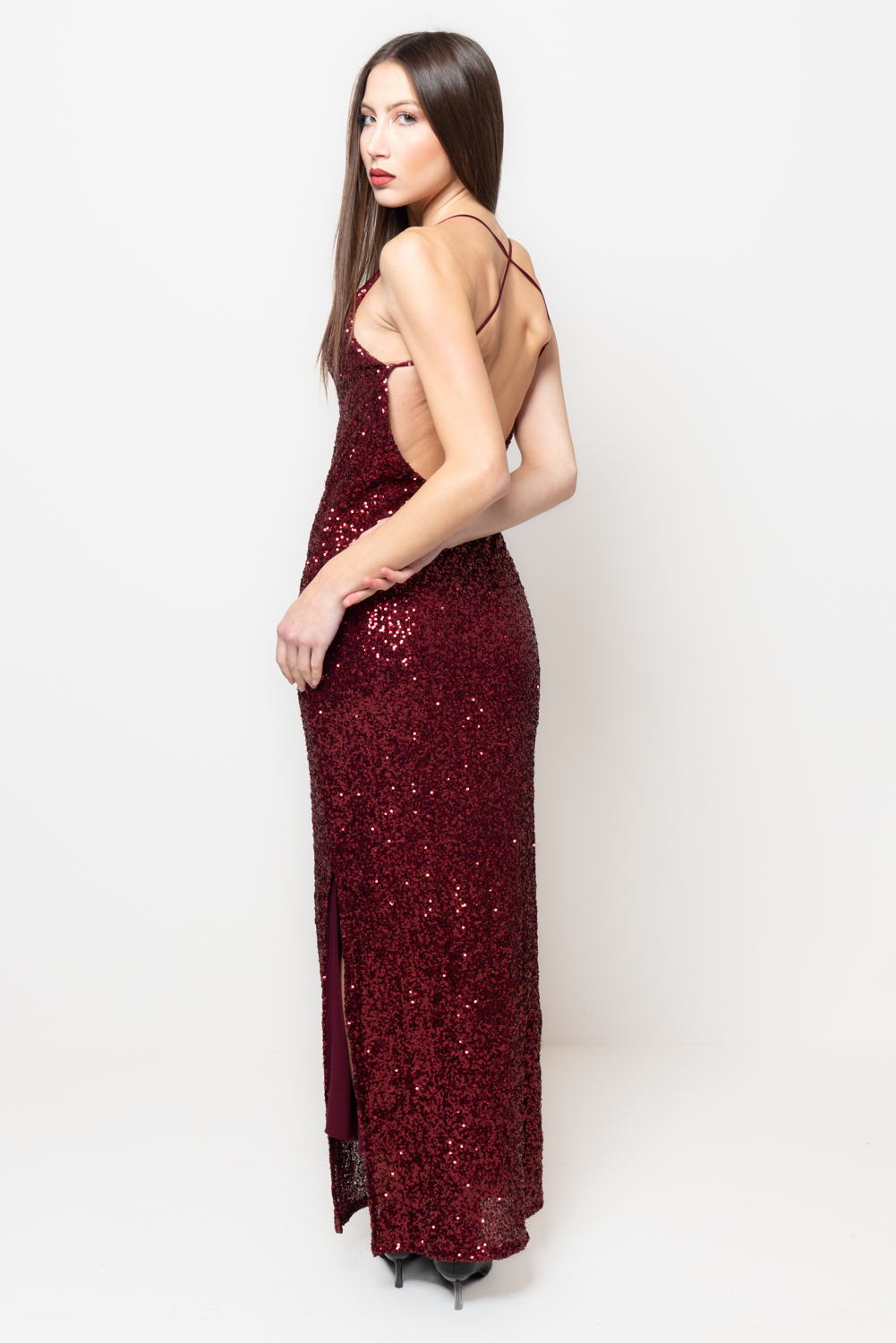 Vestito corto bordeaux con paillettes e scollatura profonda