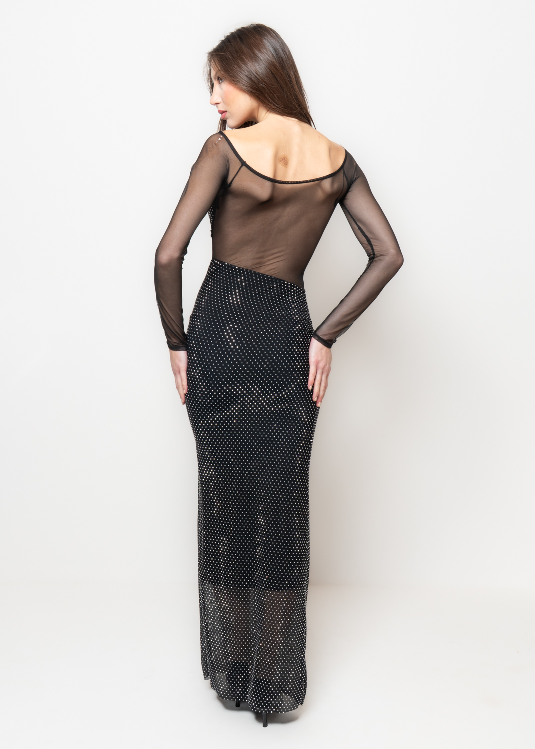 Abito nero elegante in tulle stretch trasparente con maniche lunghe e corpino a cuore impreziosito da strass luminosi. La silhouette aderente valorizza le forme con sensualità, mentre il gioco di trasparenze crea un effetto vedo-non-vedo sofisticato. Il tessuto elasticizzato assicura una vestibilità confortevole e avvolgente. Un abito lungo nero perfetto per serate seducenti dal fascino moderno.