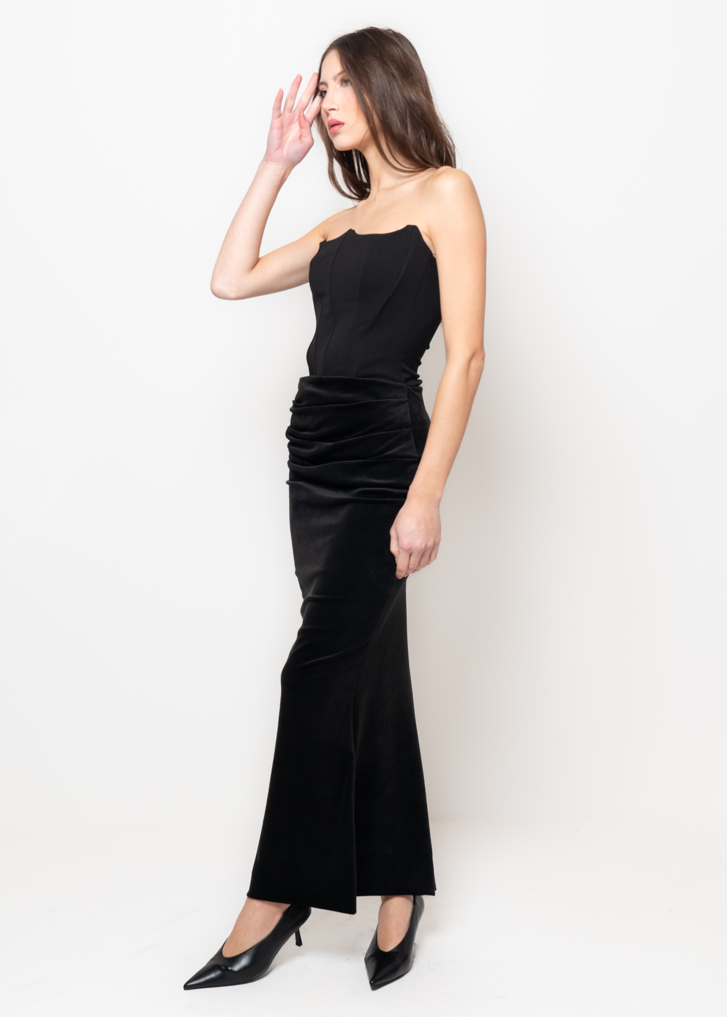Abito lungo nero con top a cuore strutturato e stecche interne che modellano il busto. La parte inferiore è realizzata in velluto liscio con drappeggio in vita che enfatizza la silhouette. Il design senza spalline e la linea aderente creano un look elegante e sofisticato, ideale per cerimonie e serate formali.