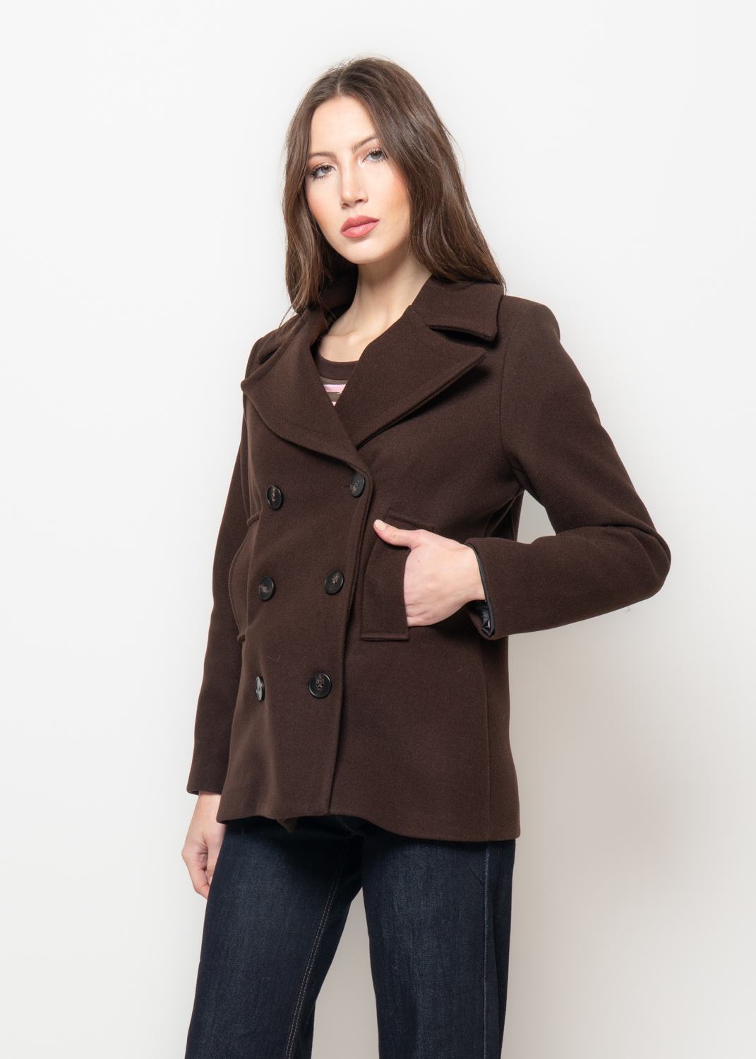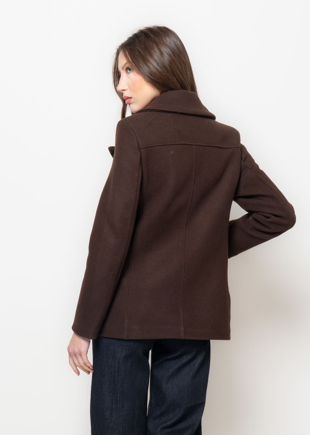 Cappotto corto in tessuto misto lana, dal colore marrone intenso e costruzione doppiopetto. Il taglio maschile ridefinisce la silhouette con eleganza strutturata, mentre il colletto ampio e i bottoni a contrasto aggiungono un tocco deciso. Linee dritte e fodera interna per una vestibilità comoda ma raffinata.