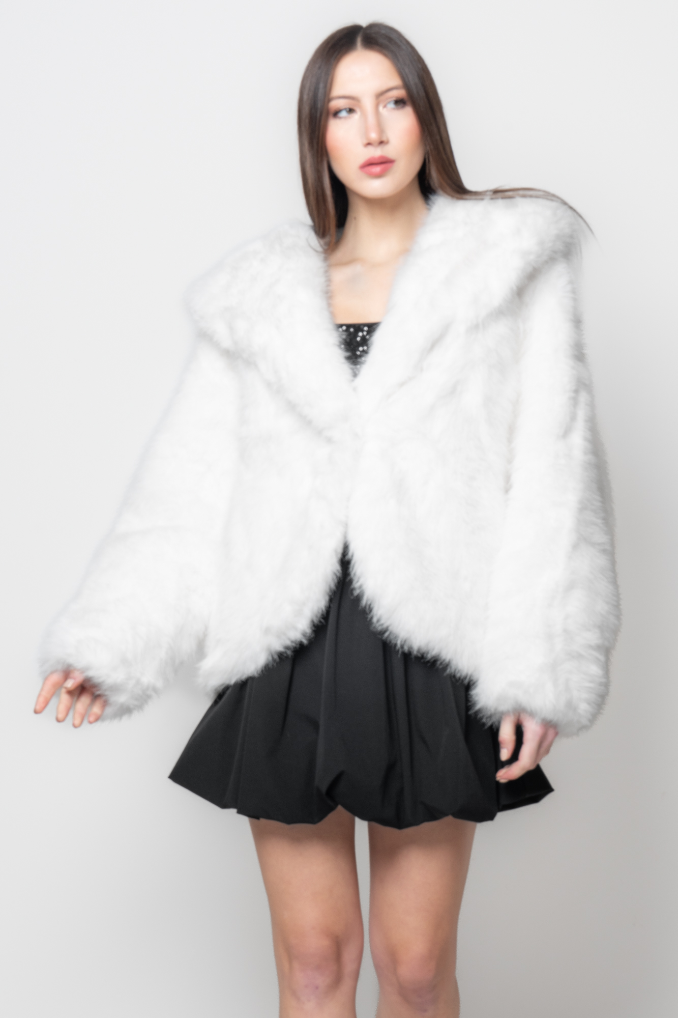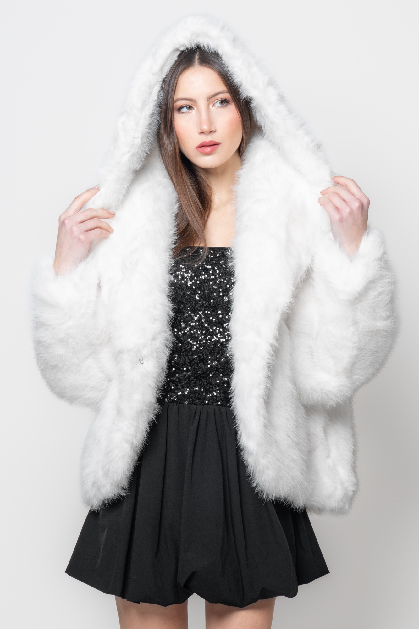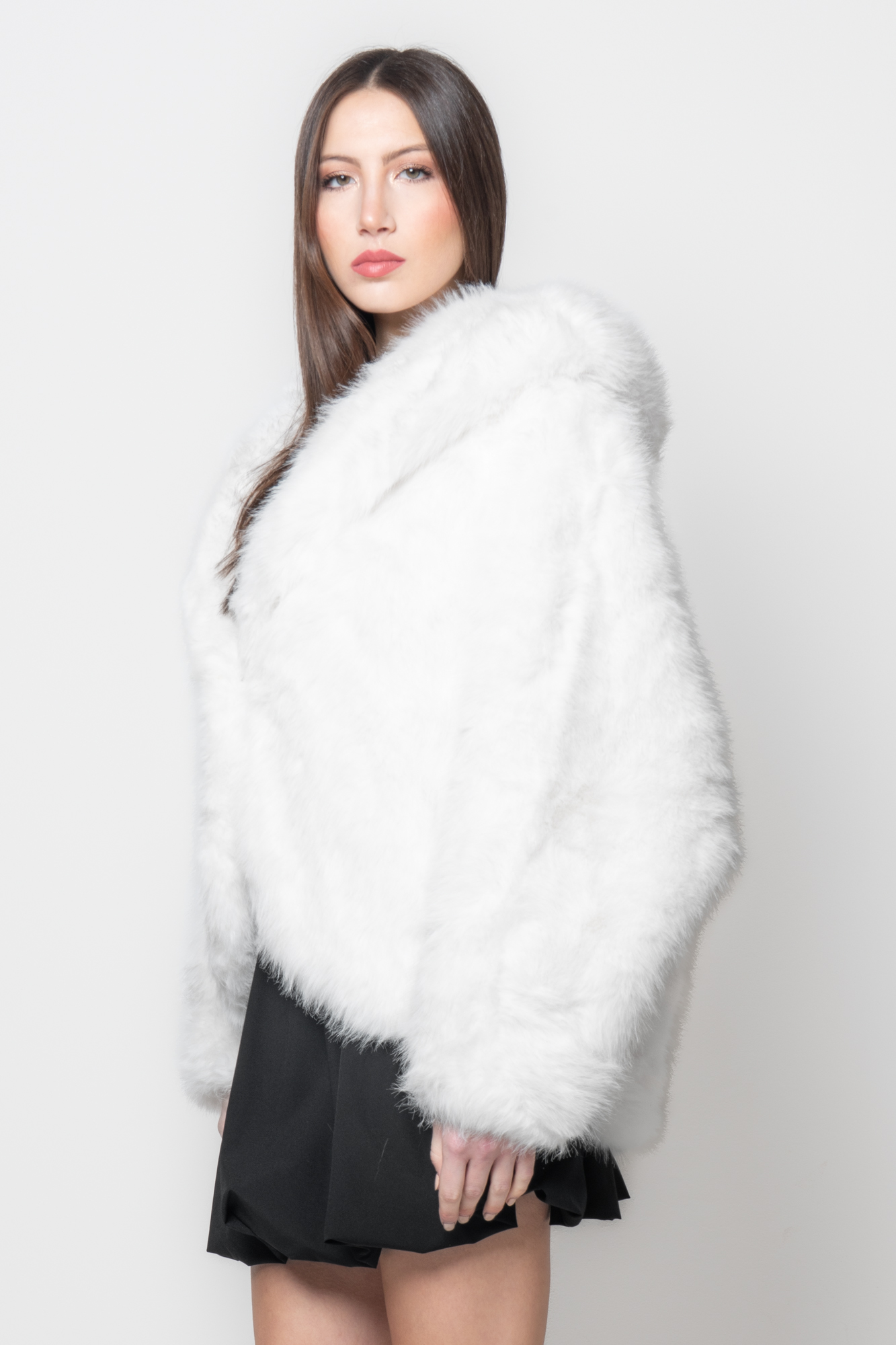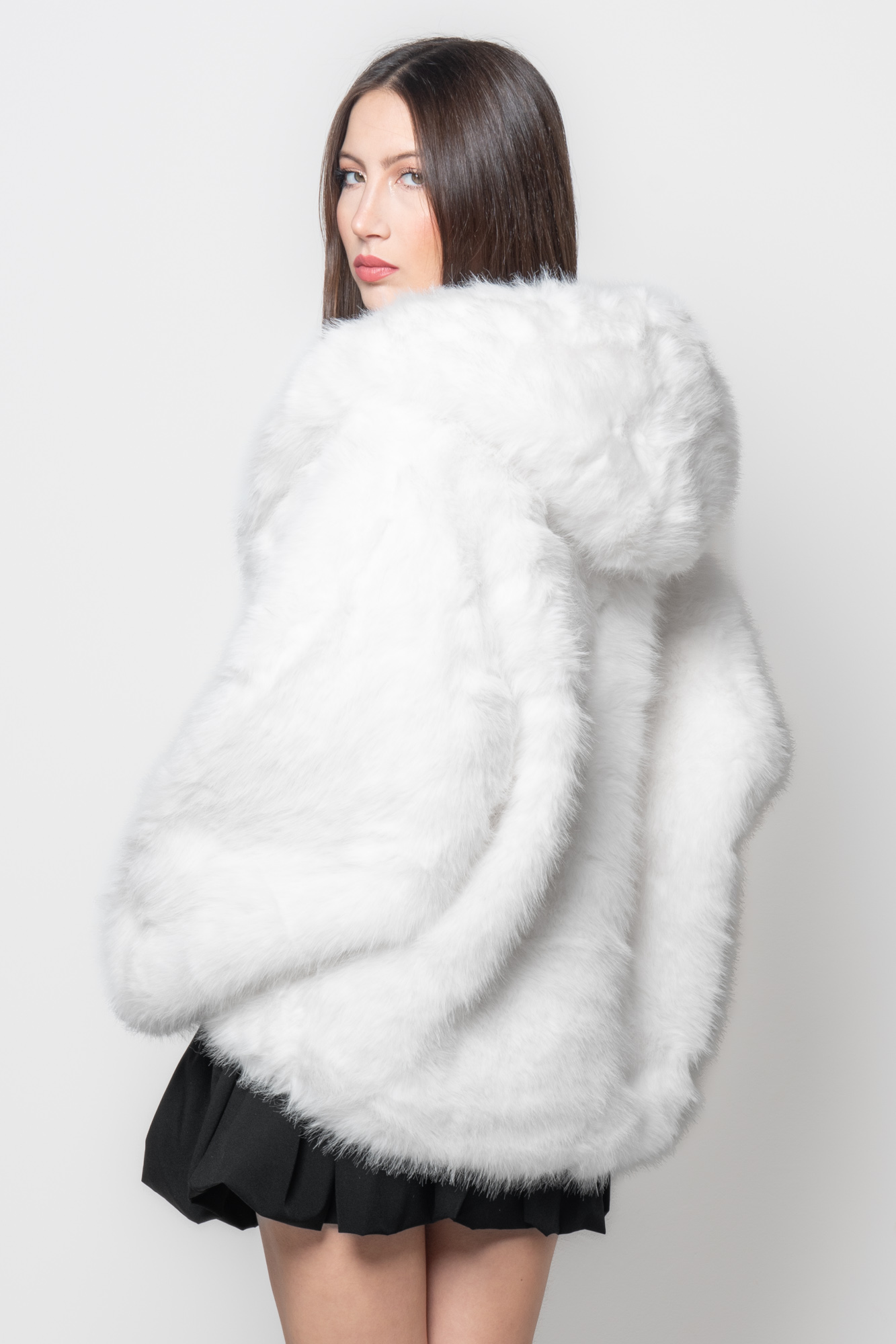 Realizzata in soffice eco pelliccia bianca, questa giacca presenta un taglio ampio e una linea avvolgente che valorizza la silhouette. Il cappuccio oversize aggiunge un tocco glamour, mentre la texture ultra-morbida assicura comfort e audacia. Una giacca in eco pelliccia elegante dal design deciso e sensuale.