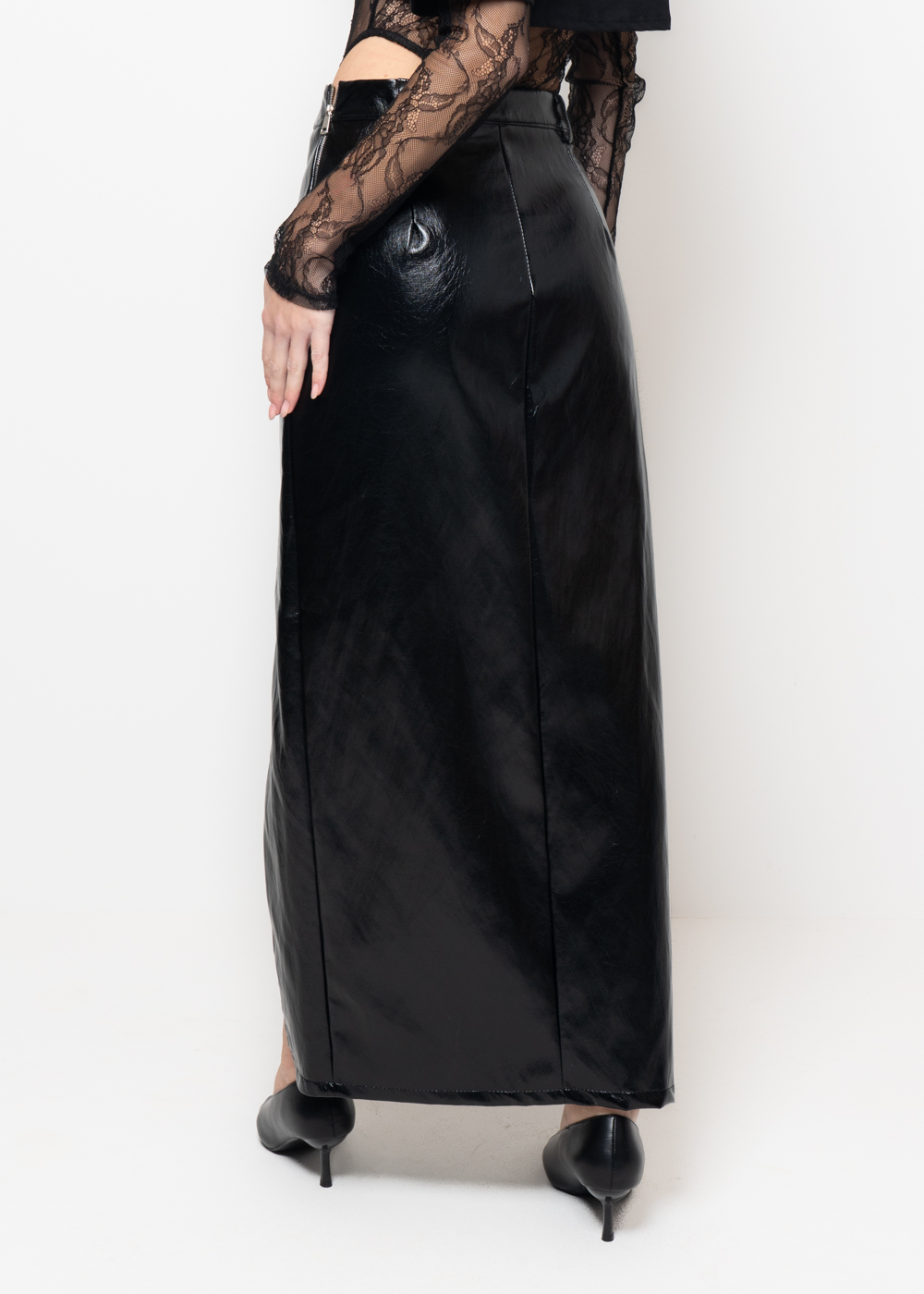 Gonna lunga in eco-pelle lucida con spacco laterale audace.