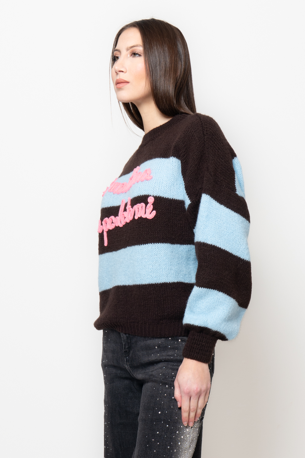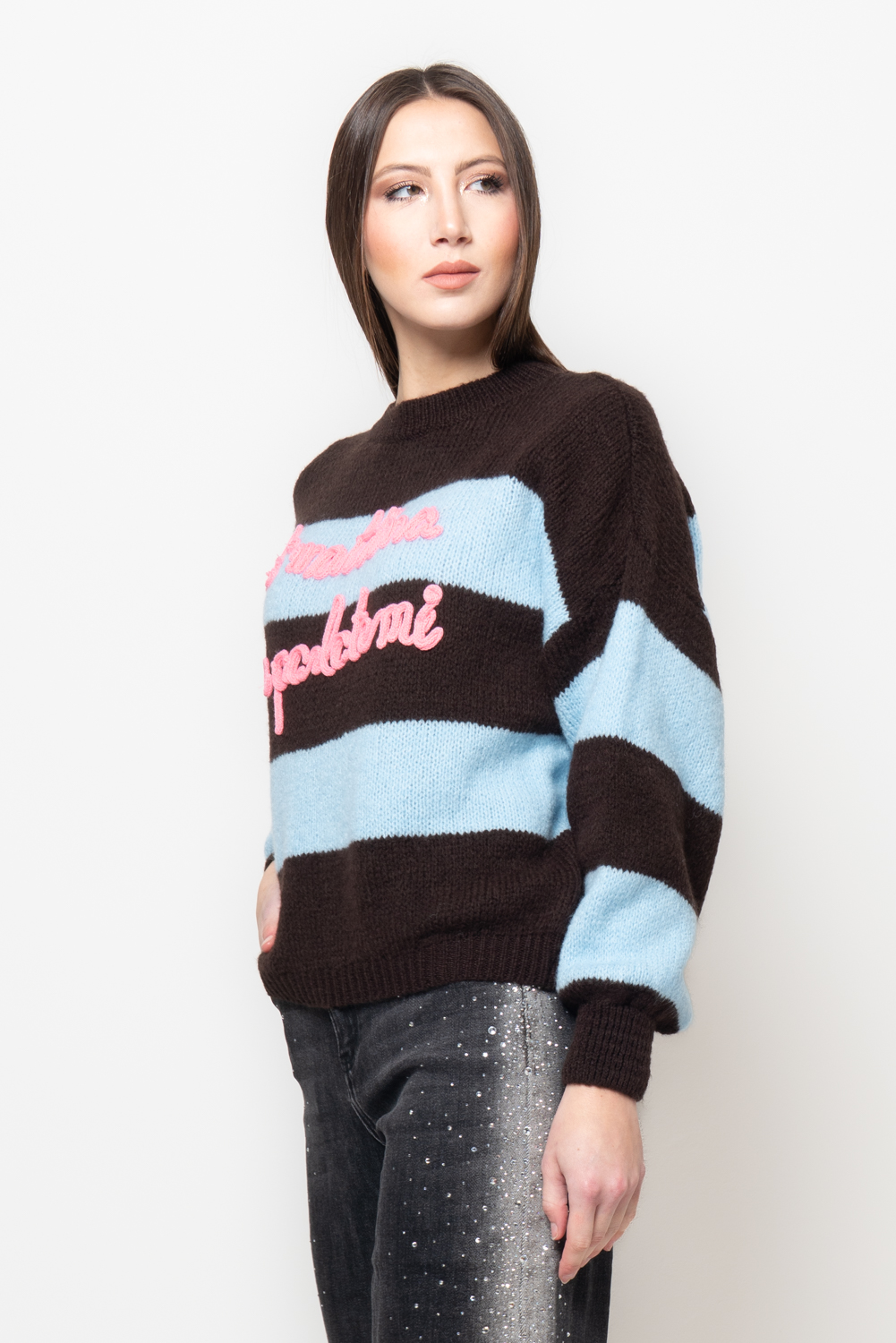 Maglione a righe marrone e azzurro con scritta ricamata rosa