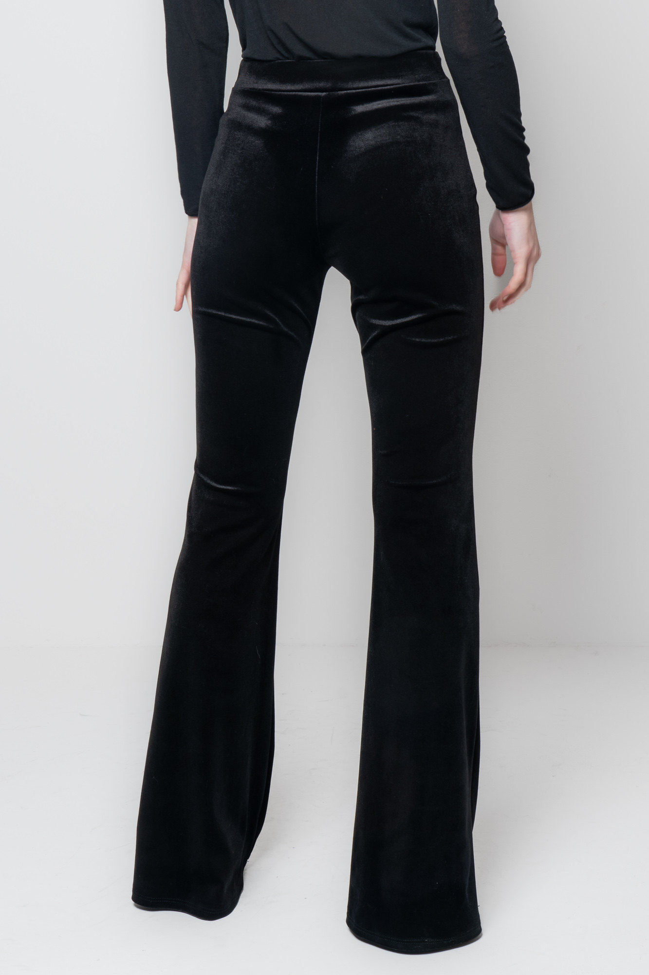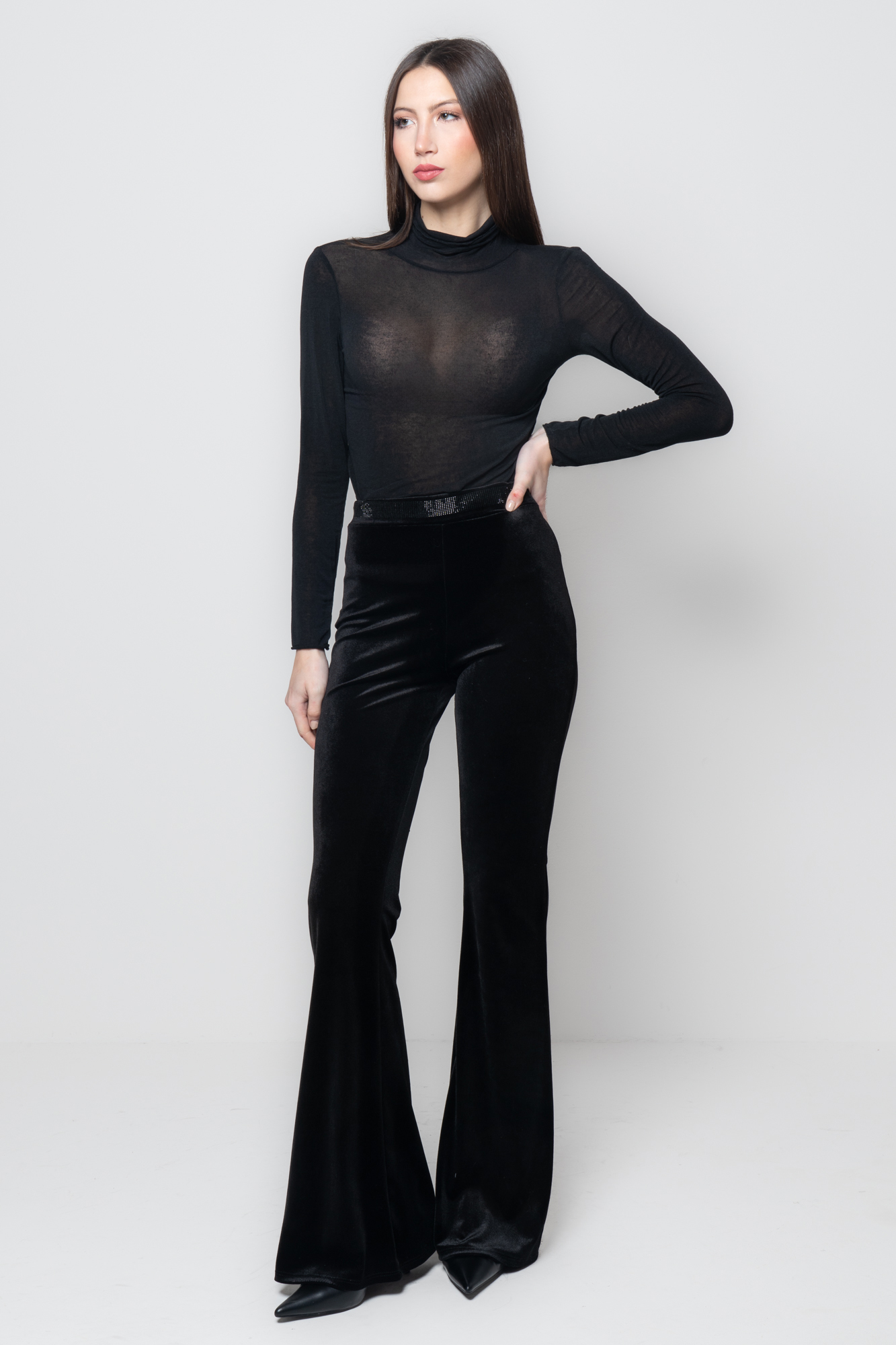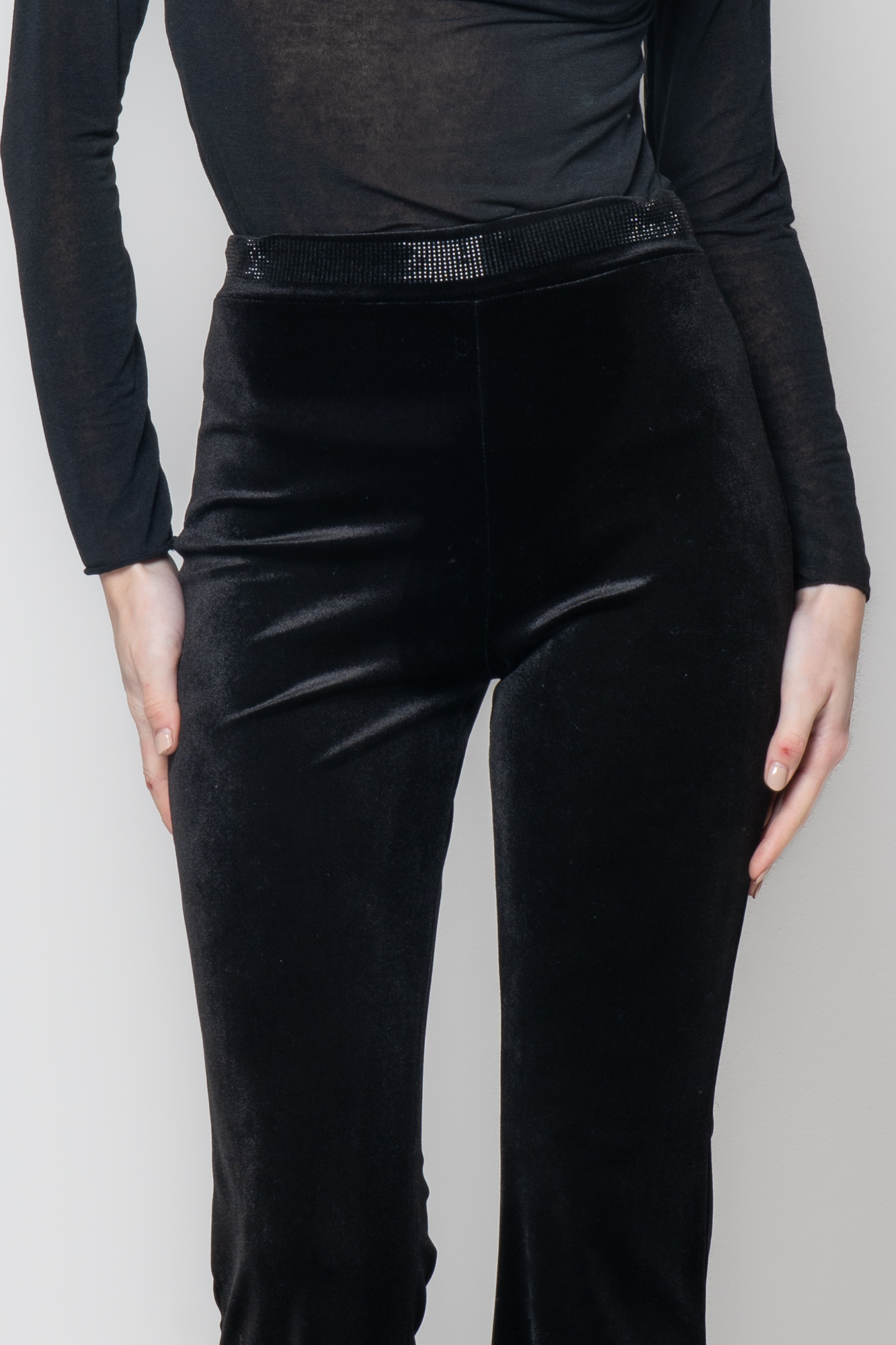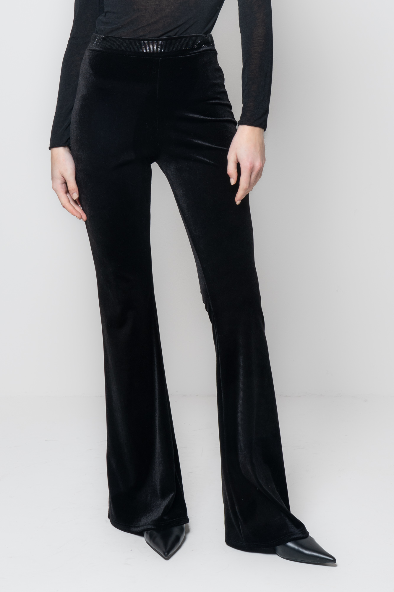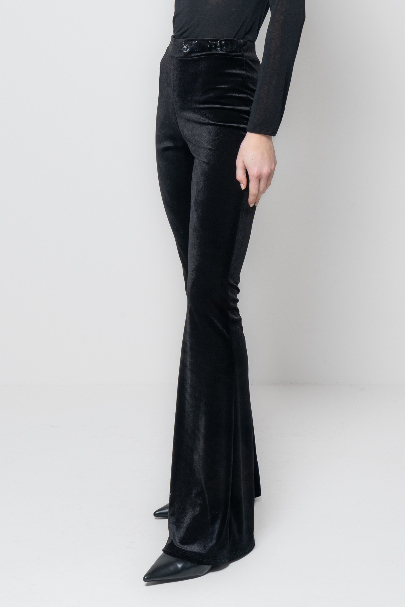 Realizzati in morbido velluto stretch, questi pantaloni neri a zampa avvolgono le curve con eleganza decisa. La linea svasata slancia la figura, mentre la cintura con micro cristalli applicati dona un tocco luminoso e sofisticato. Perfetti per definire un look audace, i pantaloni in velluto nero combinano sensualità e carattere. Vestibilità aderente sui fianchi, con gamba ampia dal ginocchio in giù.
