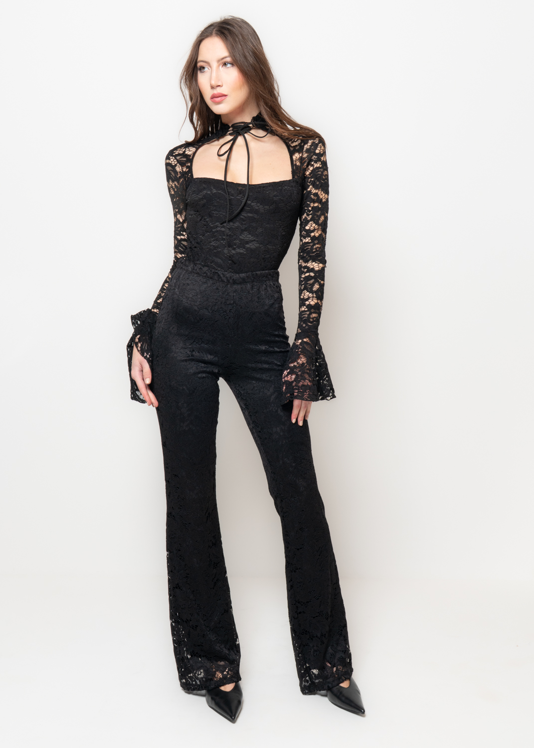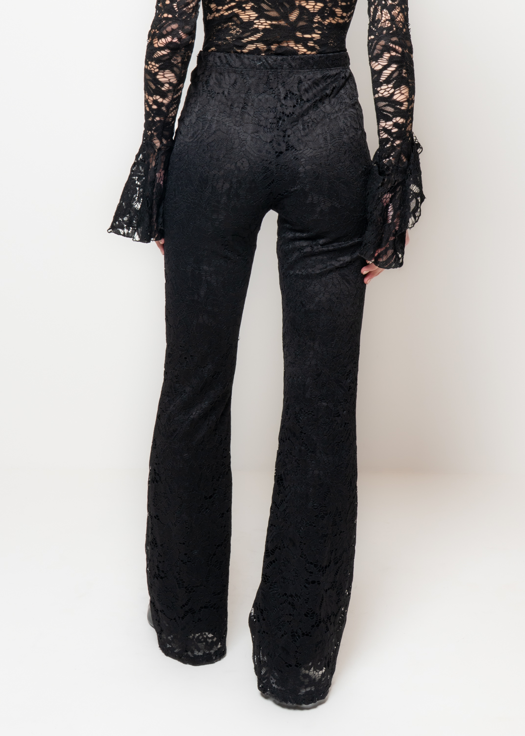 Pantaloni neri in pizzo con taglio svasato e vita alta