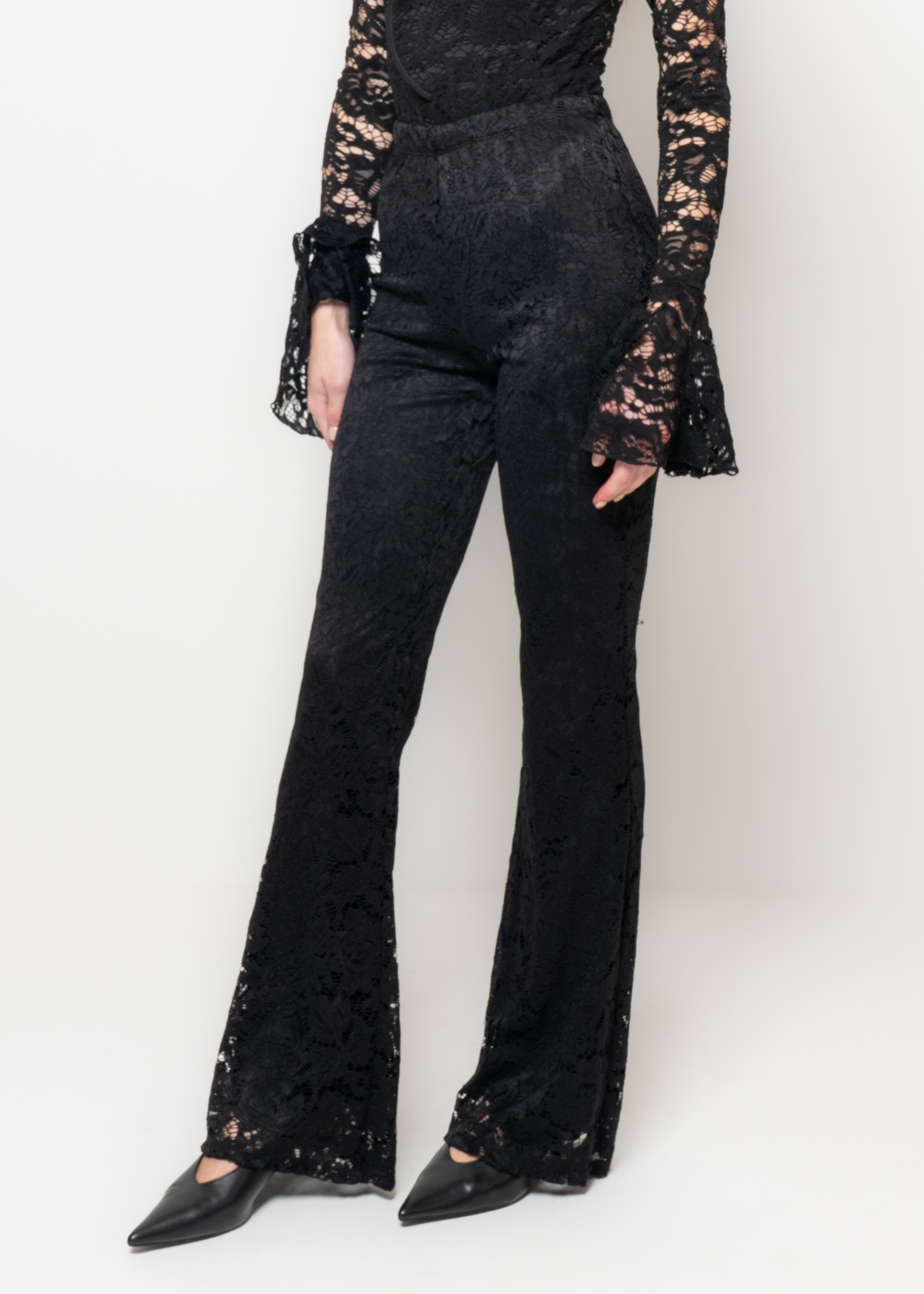 Realizzati in pizzo nero leggero e semi-trasparente, questi pantaloni a vita alta definiscono la silhouette con un taglio svasato fluido e seducente. Il design delicato ma deciso li rende ideali per completare look sofisticati e audaci. Il tessuto elasticizzato assicura comfort e aderenza al corpo, esaltando ogni movimento.