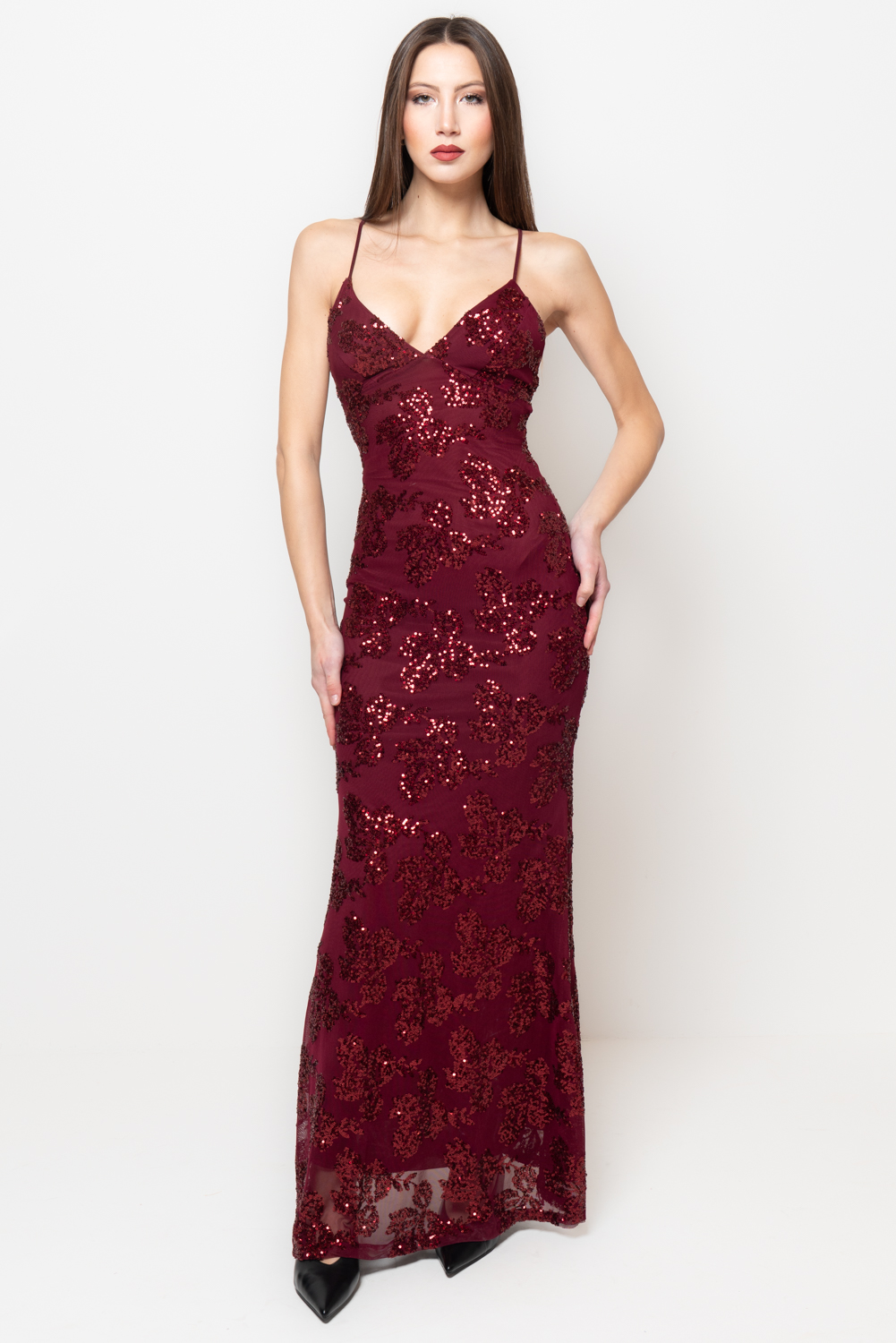 Vestito bordeaux aderente in tessuto stretch rivestito di paillettes tono su tono, con profonda scollatura a V e spalline sottili. Il taglio valorizza la silhouette con eleganza, mentre i ricami scintillanti donano un’allure seducente. Ideale per look da sera grintosi e raffinati, è un abito nero elegante reinterpretato con audacia e colore.