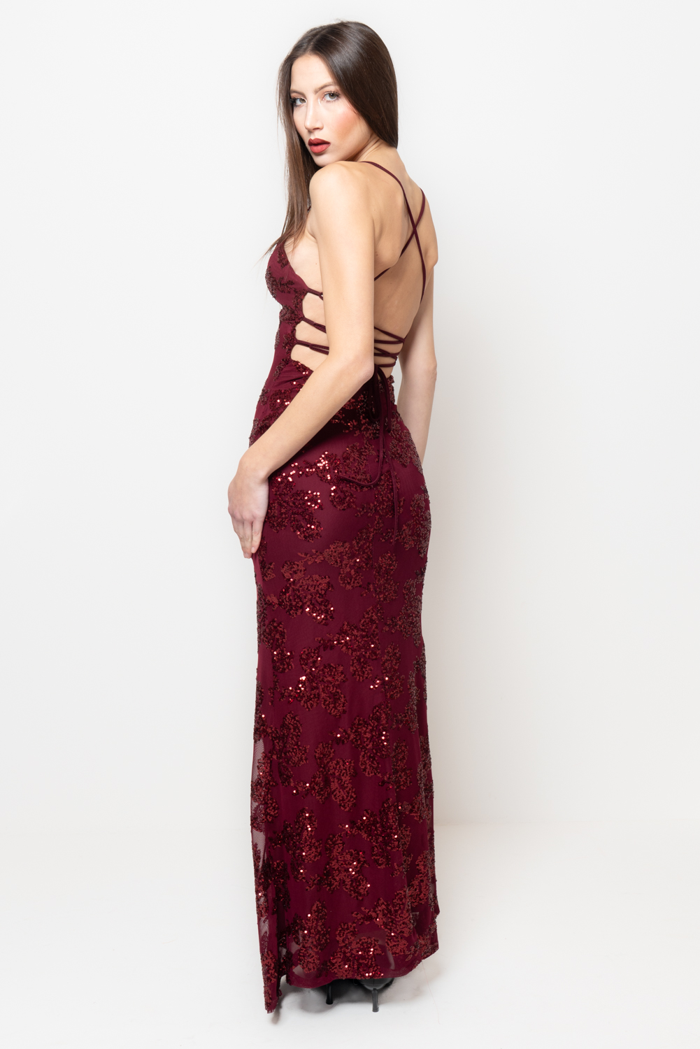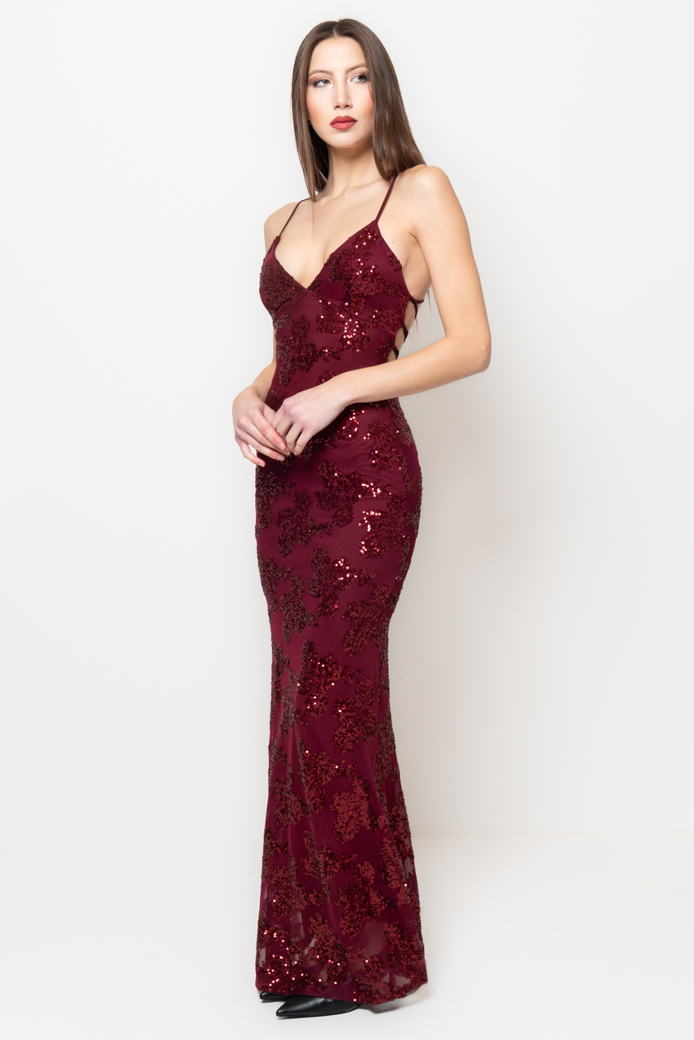 Vestito bordeaux aderente con paillettes e scollatura a V